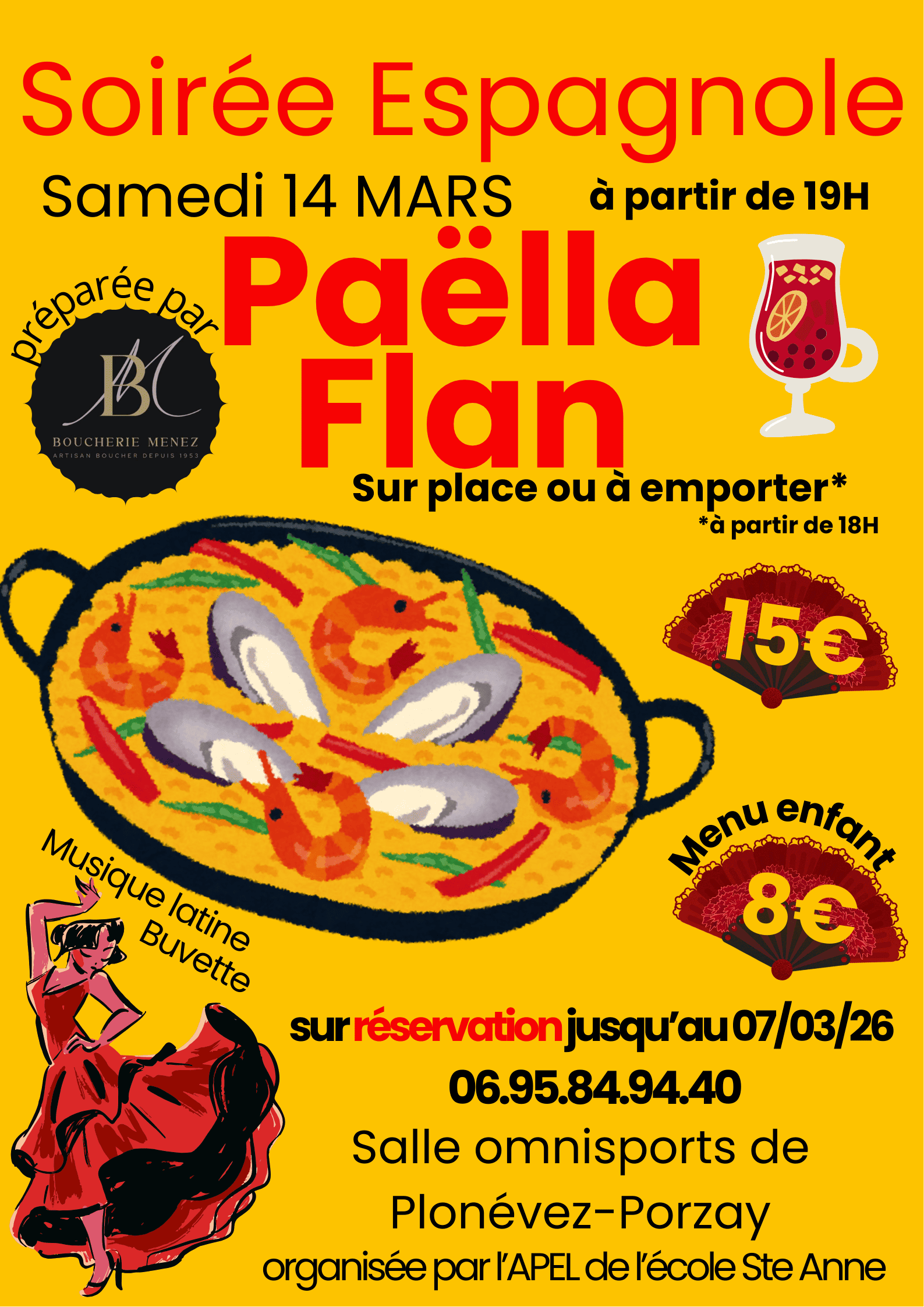 Profitez d’une ambiance caliente et régalez-vous avec une délicieuse paëlla préparée par la boucherie Menez. 🍽️ Pour le dessert, ne manquez pas notre succulent flan !