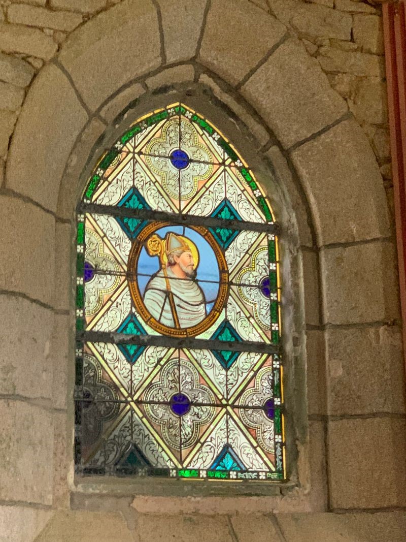 Celui de gauche présente Saint Jean dans un médaillon sur un vitrail provenant de l’atelier Le Bihan à Quimper.